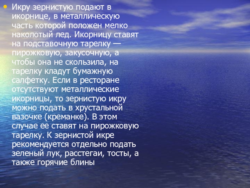 мелко наколотый лед. Икорницу ставят на подставочную тарелку — пирожковую, закусочную, а чтобы она не скользила, на тарелку кладут бумажную салфетку. Если в ресторане отсутствуют металлические икорницы, то зернистую икру можно подать в хрустальной вазочке (креманке). В этом случае ее ставят на пирожковую тарелку. К зернистой икре рекомендуется отдельно подать зеленый лук, расстегаи, тосты, а также горячие блины