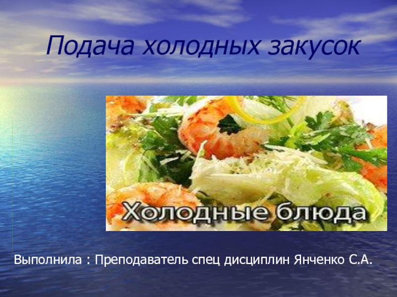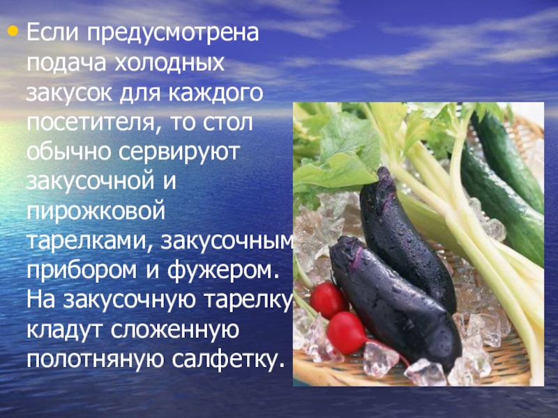 малосольная, отварная, заливная рыба или под маринадом и др.), затем мясную, закуску из дичи, овощную и т.д. Если посетители желают овощей натуральных, то их подают после икры с маслом.