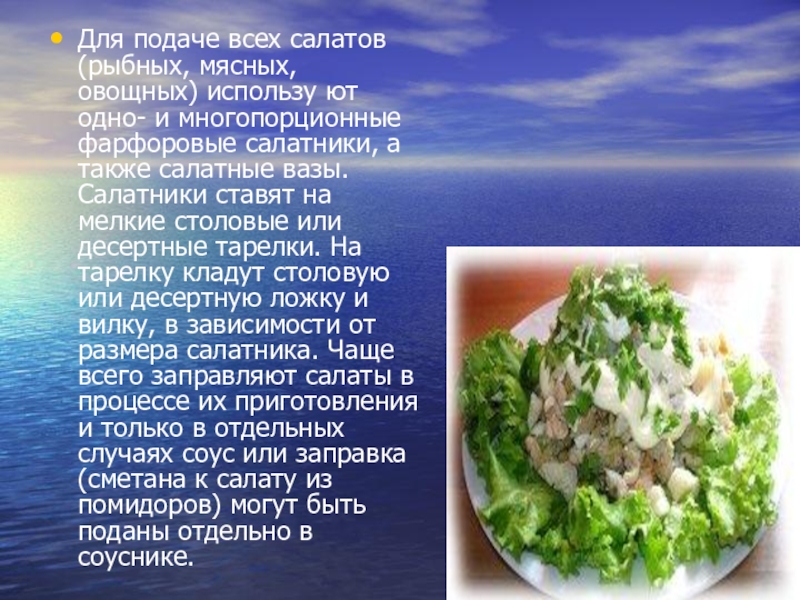 и многопорционные фарфоровые салатники, а также салатные вазы. Салатники ставят на мелкие столовые или десертные тарелки. На тарелку кладут столовую или десертную ложку и вилку, в зависимости от размера салатника. Чаще всего заправляют салаты в процессе их приготовления и только в отдельных случаях соус или заправка (сметана к салату из помидоров) могут быть поданы отдельно в соуснике.