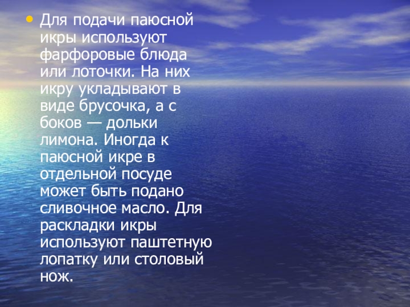 них икру укладывают в виде брусочка, а с боков — дольки лимона. Иногда к паюсной икре в отдельной посуде может быть подано сливочное масло. Для раскладки икры используют паштетную лопатку или столовый нож.
