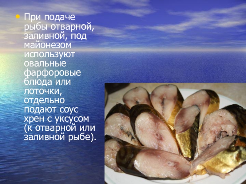 При подаче рыбы отварной, заливной, под майонезом используют овальные фарфоровые