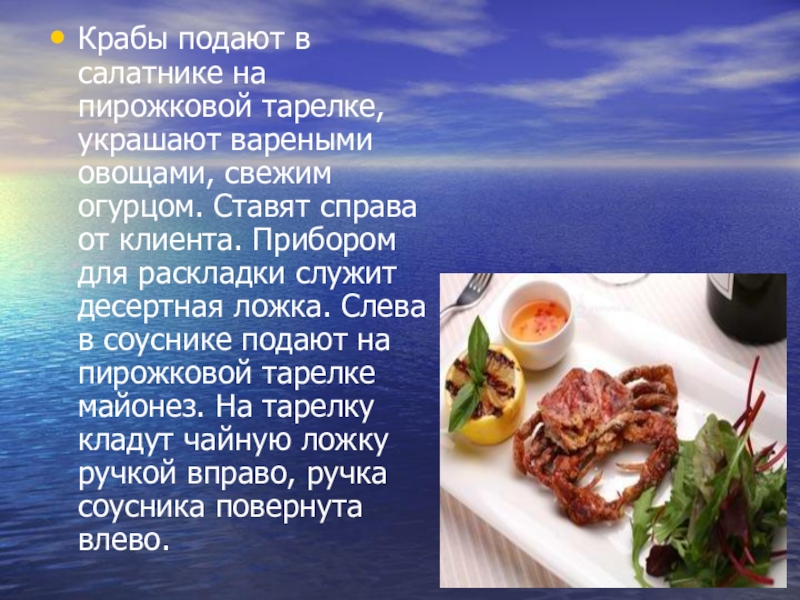 Крабы подают в салатнике на пирожковой тарелке, украшают вареными овощами,