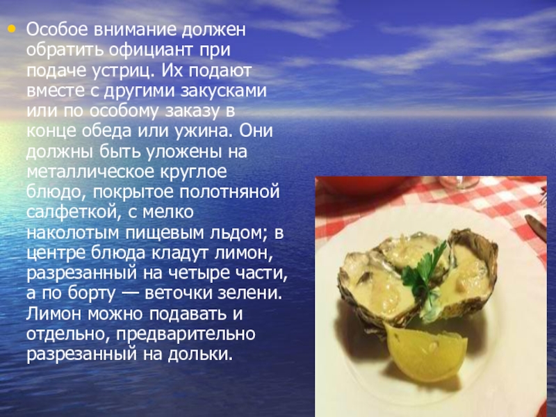 Особое внимание должен обратить официант при подаче устриц. Их подают