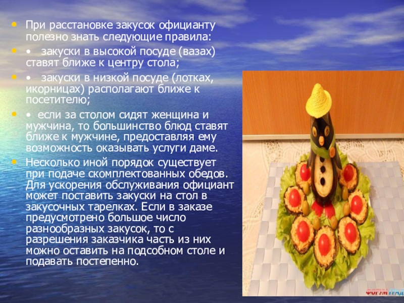 • закуски в низкой посуде (лотках, икорницах) располагают ближе к посетителю;