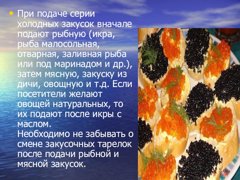 При подаче серии холодных закусок вначале подают рыбную (икра, рыба