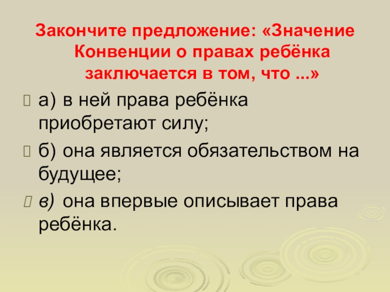 Слайд 17Закончите предложение: «Значение Конвенции о правах ребёнка заключается в том, что