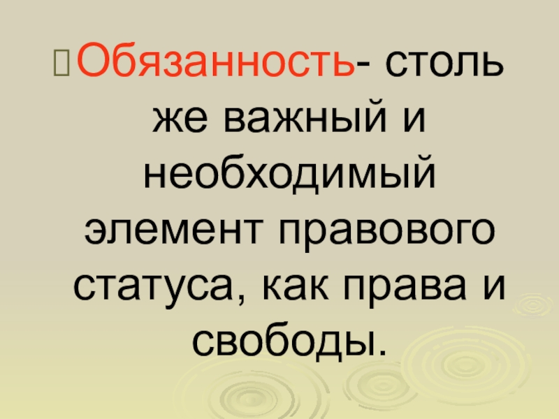 Обязанность- столь же важный и необходимый элемент правового статуса, как права и свободы.