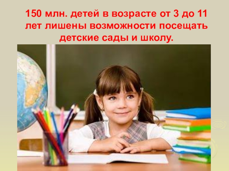 150 млн. детей в возрасте от 3 до 11 лет лишены возможности посещать детские сады и школу.