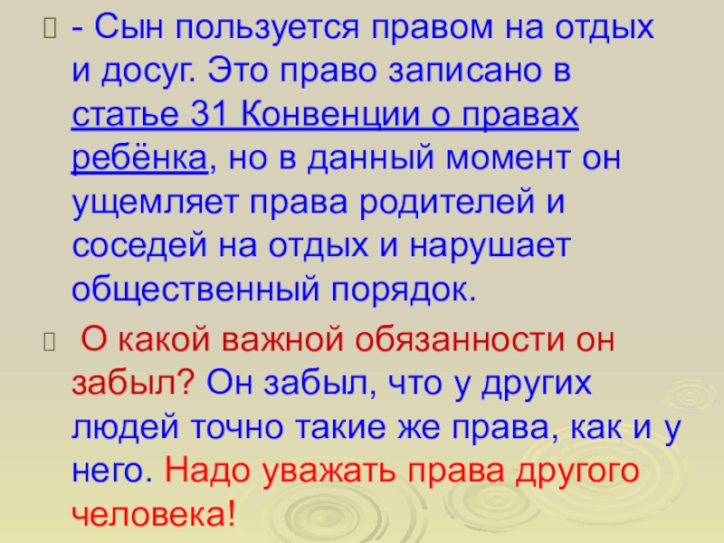 - Сын пользуется правом на отдых и досуг. Это право записано
