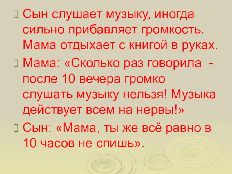 Сын слушает музыку, иногда сильно прибавляет громкость. Мама отдыхает с книгой в руках.Мама: «Сколько раз говорила -