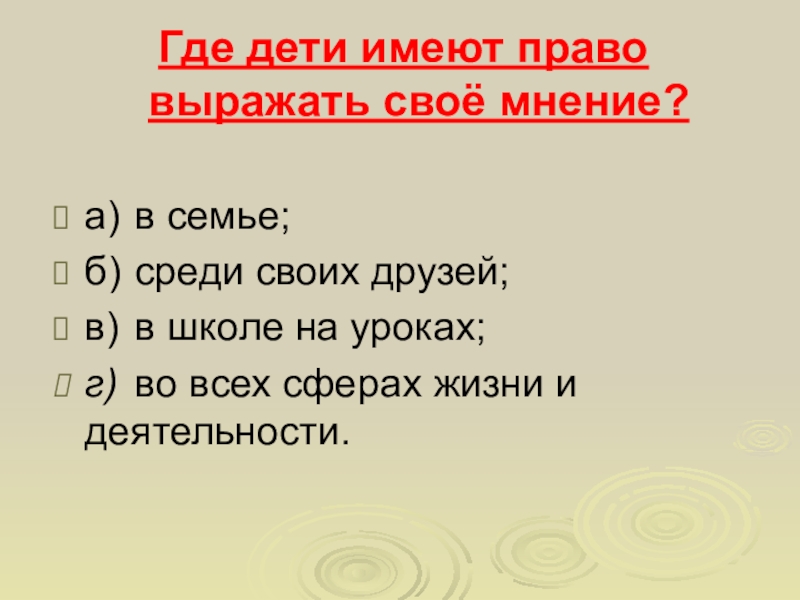 Где дети имеют право выражать своё мнение?а)	в семье;б)	среди своих друзей;в)	в школе на уроках;г)	во всех сферах жизни и
