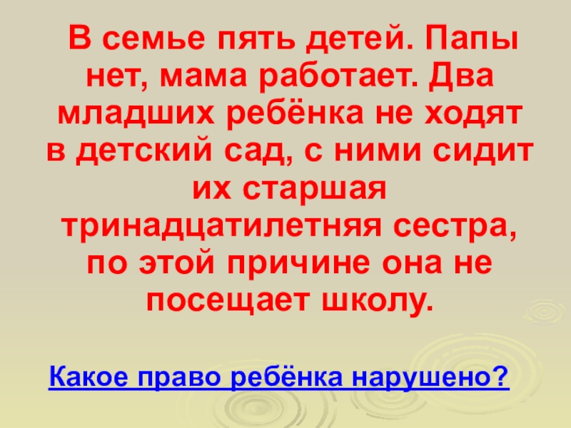 Слайд 21 В семье пять детей. Папы нет, мама работает. Два