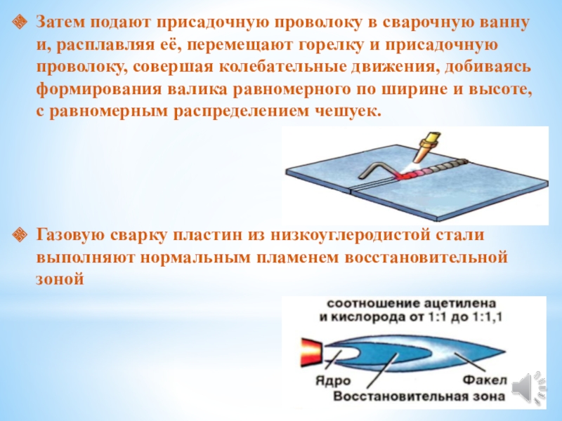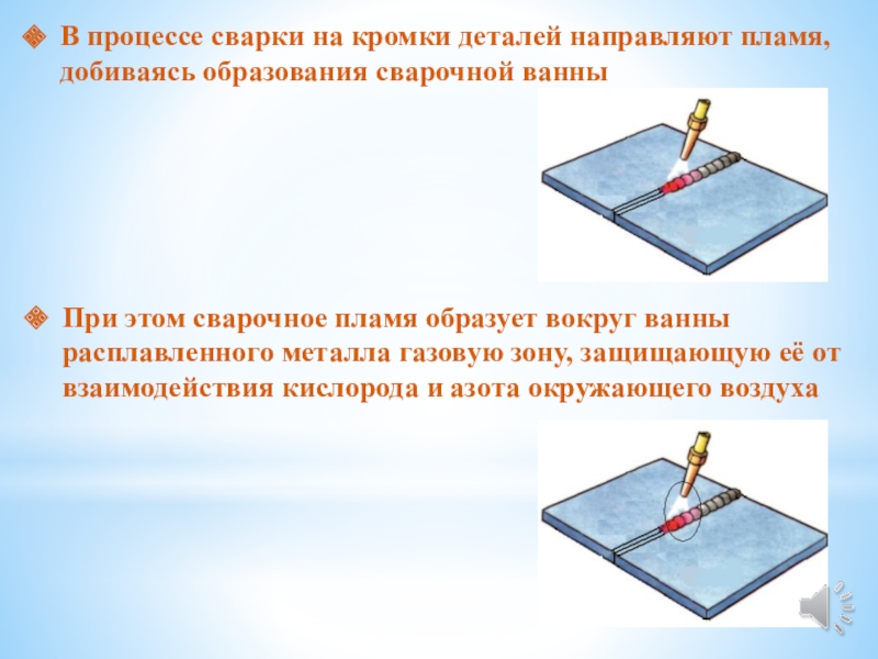 При этом сварочное пламя образует вокруг ванны расплавленного металла газовую зону, защищающую её от взаимодействия кислорода и азота окружающего воздуха