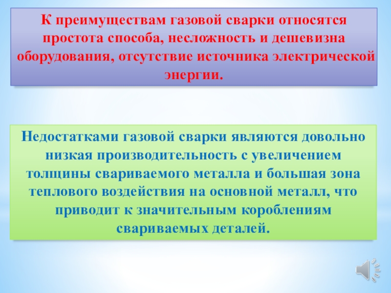 Недостатками газовой сварки являются довольно низкая производительность с увеличением толщины свариваемого металла и большая зона теплового воздействия на основной металл, что приводит к значительным короблениям свариваемых деталей.
