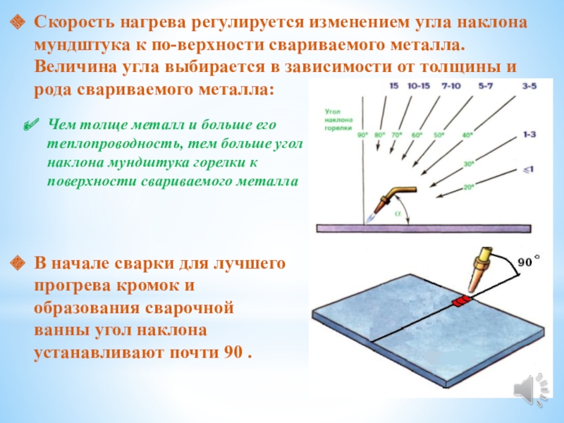 Чем толще металл и больше его теплопроводность, тем больше угол наклона мундштука горелки к поверхности свариваемого металла