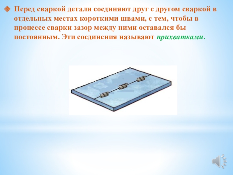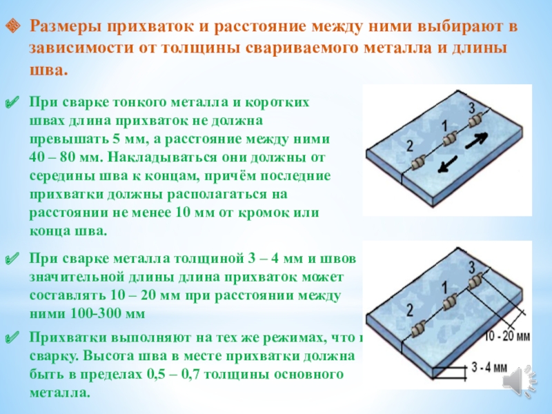 При сварке тонкого металла и коротких швах длина прихваток не должна превышать 5 мм, а расстояние между ними 40 – 80 мм. Накладываться они должны от середины шва к концам, причём последние прихватки должны располагаться на расстоянии не менее 10 мм от кромок или конца шва.