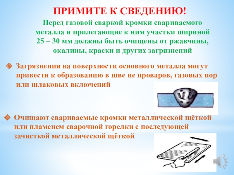 Очищают свариваемые кромки металлической щёткой или пламенем сварочной горелки с последующей зачисткой металлической щёткой