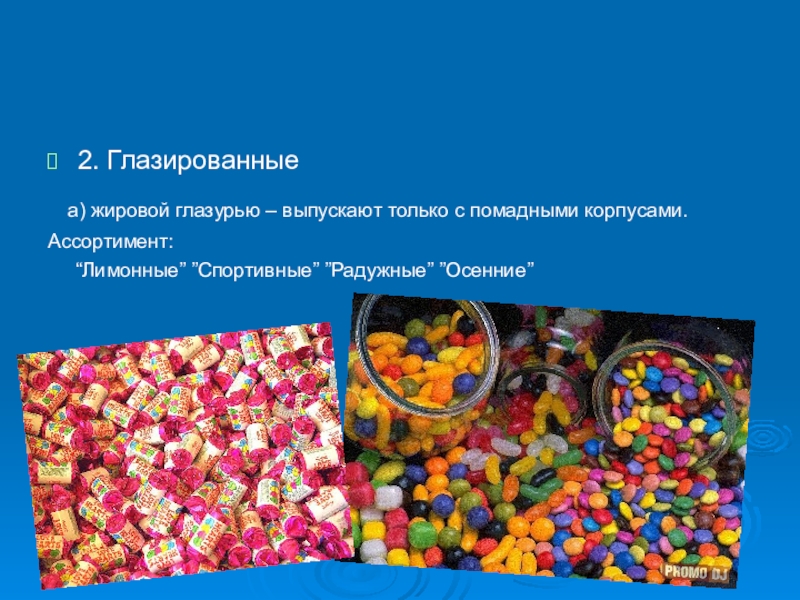 2. Назовите ассортимент конфет глазированных жировой глазурью.