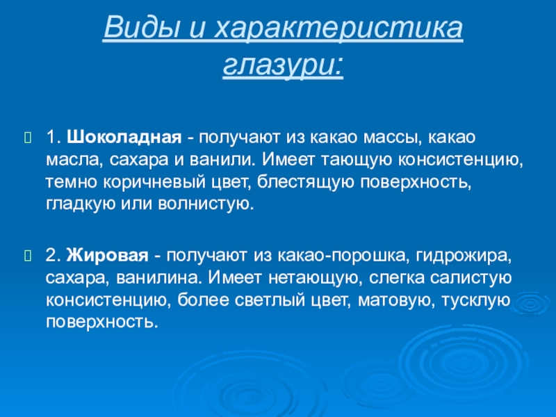 2. Жировая - получают из какао-порошка, гидрожира, сахара, ванилина. Имеет нетающую, слегка салистую консистенцию, более светлый цвет, матовую, тусклую поверхность.