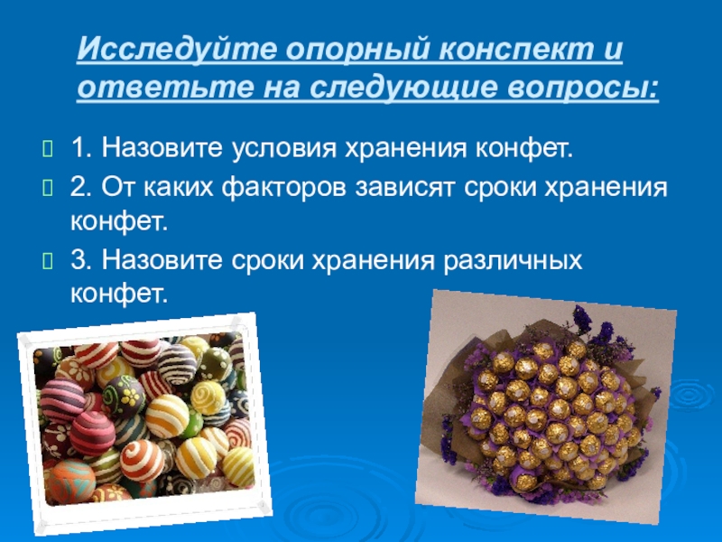 Слайд 17Исследуйте опорный конспект и назовите показатели, по которым оценивают качество конфет.