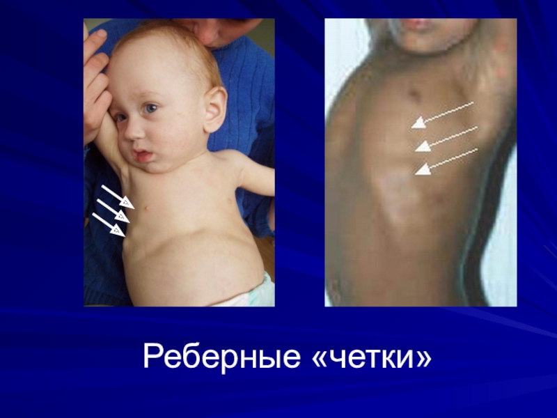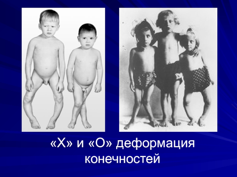 При осмотре определяются увеличенные теменные бугры, 1 нижний и 2 верхних резца, утолщения на реберных дугах, выраженный кифоз, утолщение запястий, ребенок стоит с помощь взрослого, нижние конечности «О»-образно деформированы.