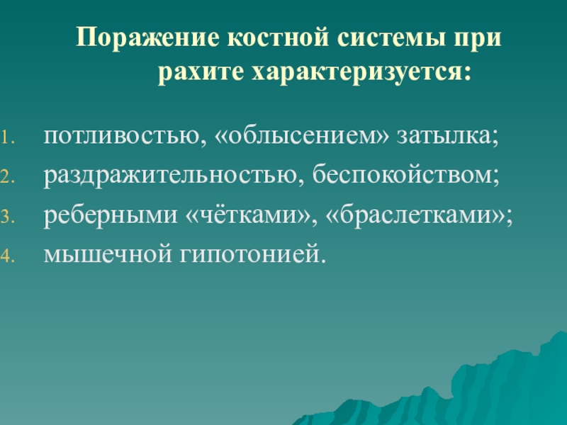 Слайд 9Поражение костной системы при рахите характеризуется: