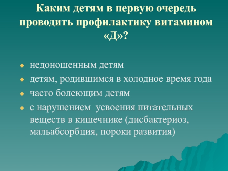 Слайд 21Каким детям в первую очередь проводить профилактику витамином «Д»?