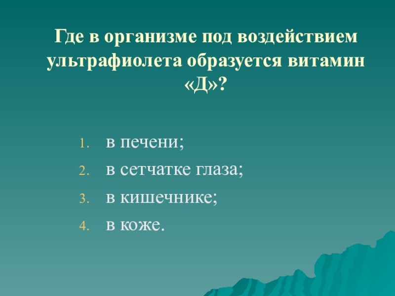 Слайд 11Где в организме под воздействием ультрафиолета образуется витамин «Д»?