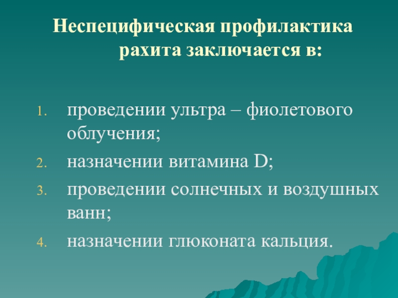Слайд 8Неспецифическая профилактика рахита заключается в: