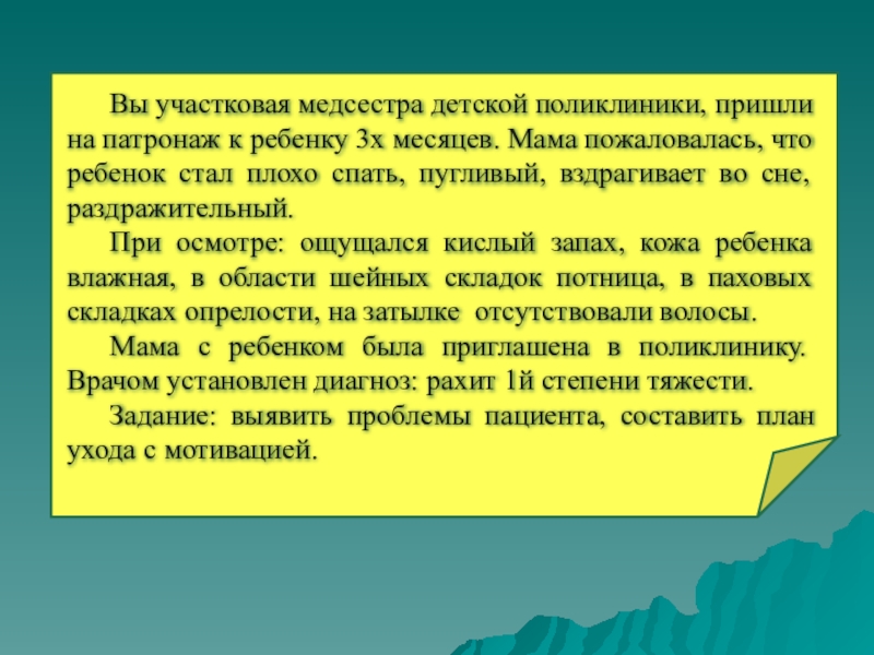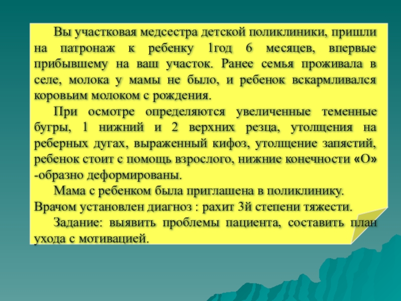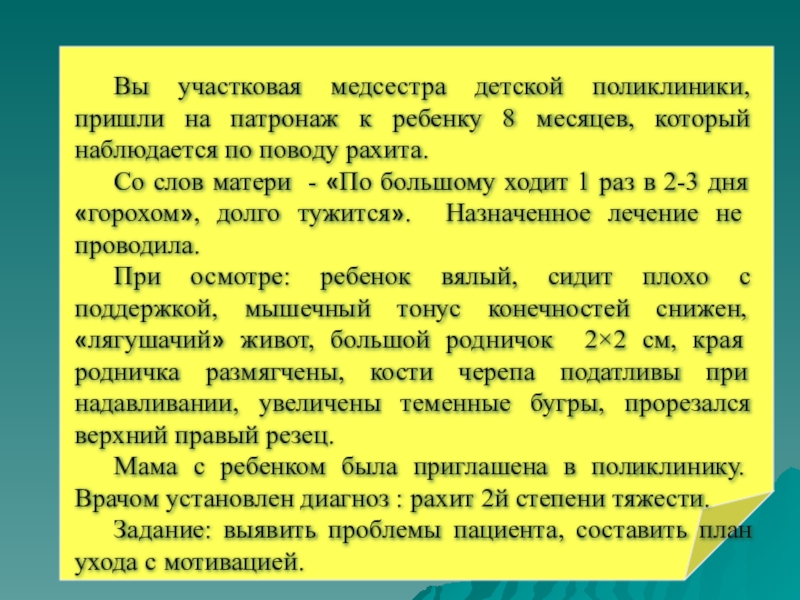 Научиться выявлять проблемы пациента, организовать сестринский уход при рахите.