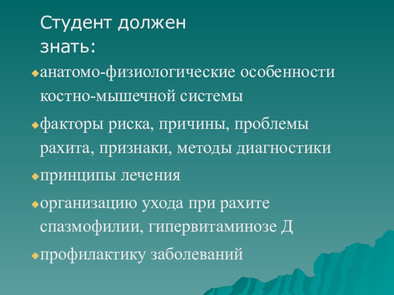 Усвоить важность проведения профилактики рахита у детей и у будущих матерей.