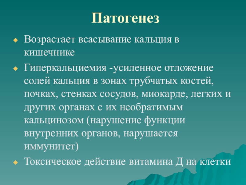 трубчатых костей, почках, стенках сосудов, миокарде, легких и других органах с их необратимым кальцинозом (нарушение функции внутренних органов, нарушается иммунитет)