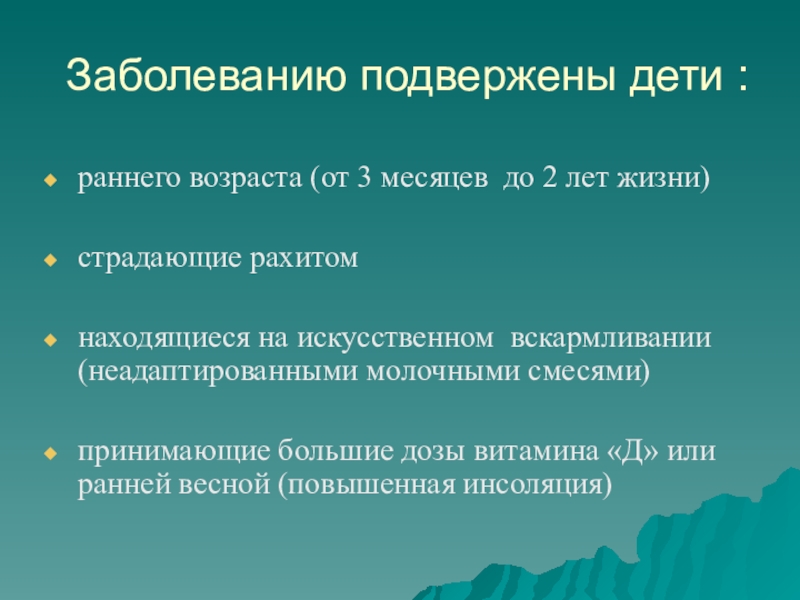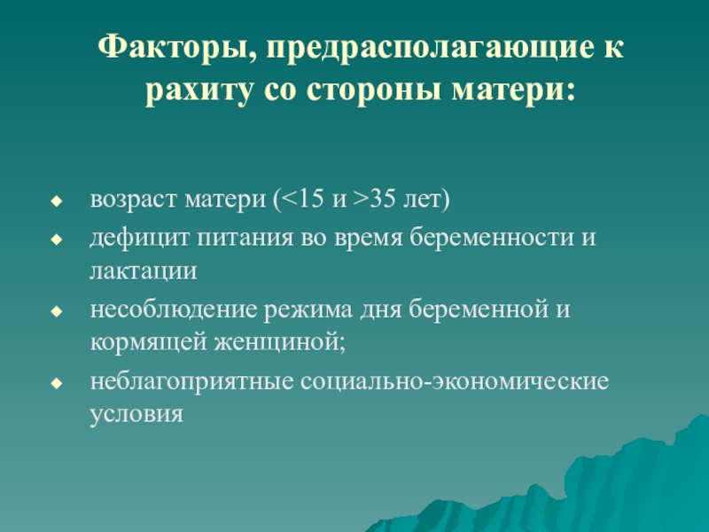 Слайд 18Факторы, предрасполагающие к рахиту со стороны матери: