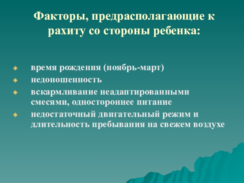 Слайд 19Факторы, предрасполагающие к рахиту со стороны ребенка:
