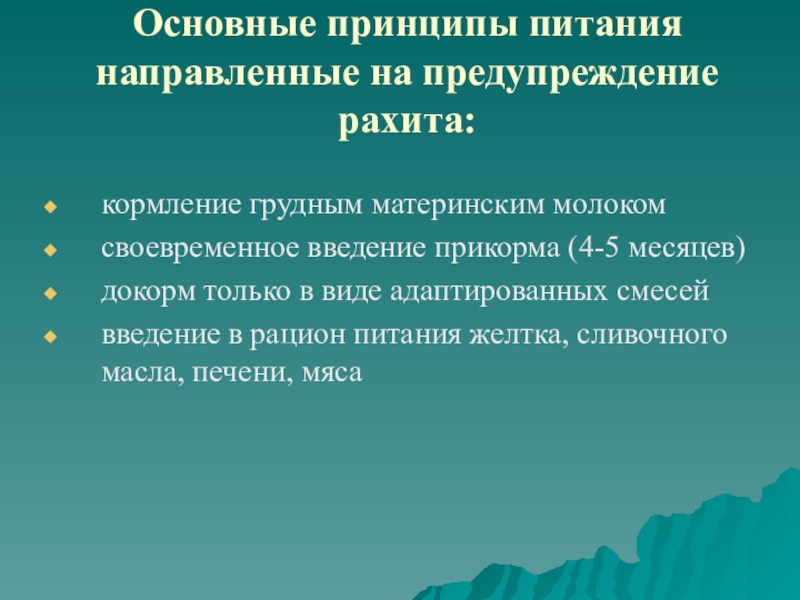 Слайд 20Основные принципы питания направленные на предупреждение рахита: