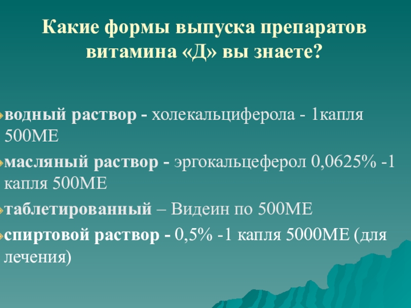 Слайд 22Какие формы выпуска препаратов витамина «Д» вы знаете?