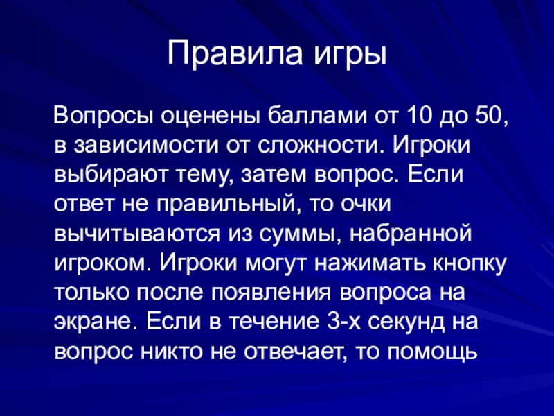 зависимости от сложности. Игроки выбирают тему, затем вопрос. Если ответ не правильный, то очки вычитываются из суммы, набранной игроком. Игроки могут нажимать кнопку только после появления вопроса на экране. Если в течение 3-х секунд на вопрос никто не отвечает, то помощь