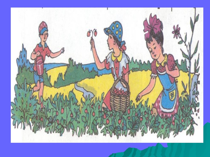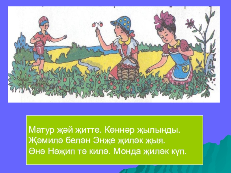 Матур җәй җитте. Көннәр җылынды. Җәмилә белән Энҗе җиләк җыя. Әнә Нәҗип тә килә. Монда җиләк күп.