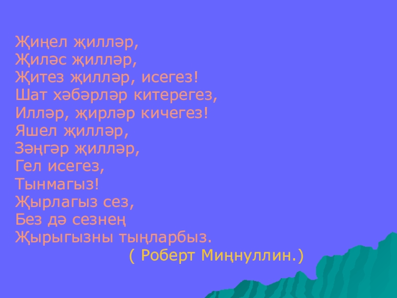 Җиңел җилләр,Җиләс җилләр,Җитез җилләр, исегез!Шат хәбәрләр китерегез,Илләр, җирләр кичегез!Яшел җилләр,Зәңгәр җилләр,Гел исегез,Тынмагыз!Җырлагыз сез,Без