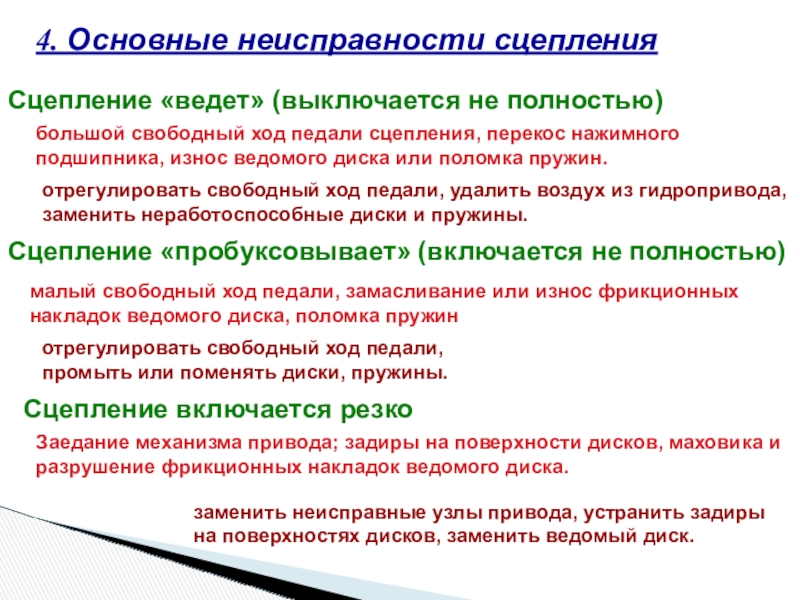 Заедание механизма привода; задиры на поверхности дисков, маховика и разрушение фрикционных накладок ведомого диска.