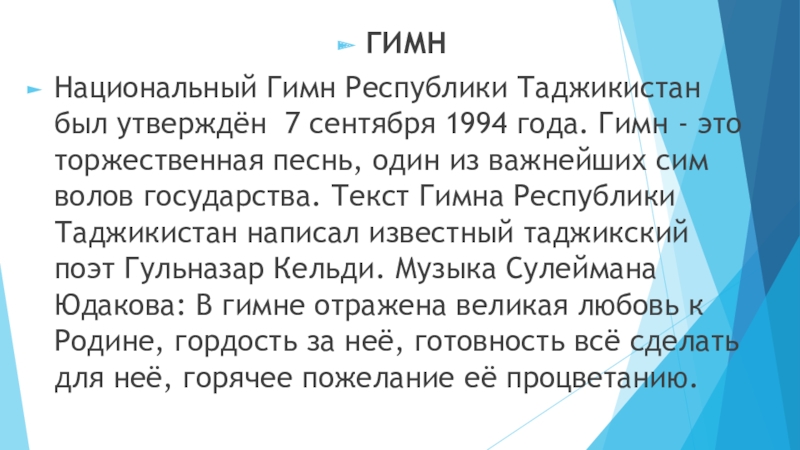 ГИМН Национальный Гимн Республики Таджикистан был утверждён 7 сентября 1994 года. Гимн - это торжественная песнь, один