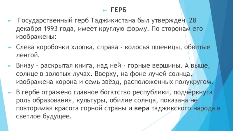 ГЕРБ Государственный герб Таджикистана был утверждён 28 декабря 1993 года, имеет круглую форму. По сторонам его изображены: