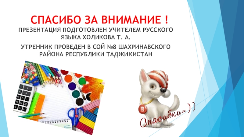 СПАСИБО ЗА ВНИМАНИЕ !ПРЕЗЕНТАЦИЯ ПОДГОТОВЛЕН УЧИТЕЛЕМ РУССКОГО ЯЗЫКА ХОЛИКОВА Т. А. УТРЕННИК ПРОВЕДЕН В СОЙ №8 ШАХРИНАВСКОГО