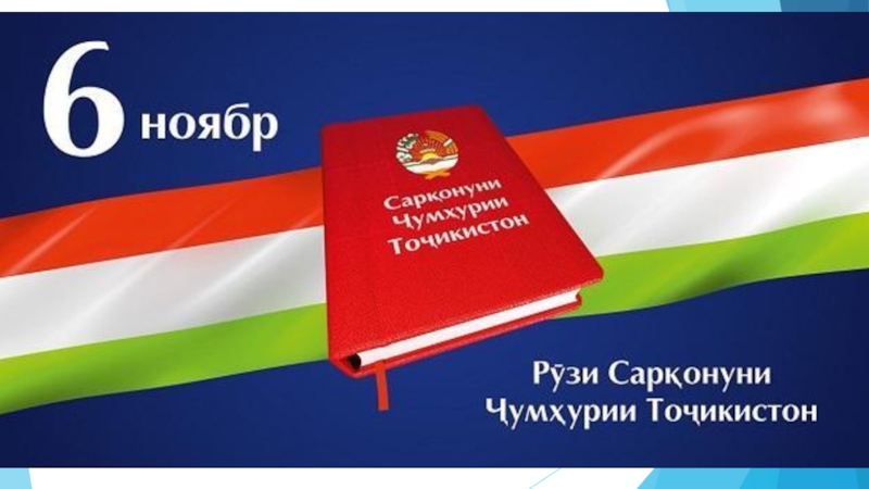 КОНСТИТУЦИЯЗдравствуйте, дорогие дети и уважаемые гости! Я конституция Республики Таджикистан. Конституция была принята 6 ноября 1994 году.