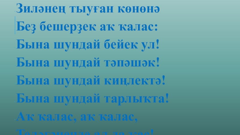 Зиләнең тыуған көнөнәБеҙ бешерҙек аҡ ҡалас:Бына шундай бейек ул!Бына шундай тәпәшәк!Бына шундай киңлектә!Бына шундай тарлыҡта!Аҡ ҡалас, аҡ