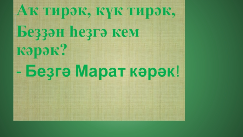 Аҡ тирәк, күк тирәк,Беҙҙән һеҙгә кем кәрәк?- Беҙгә Марат кәрәк!