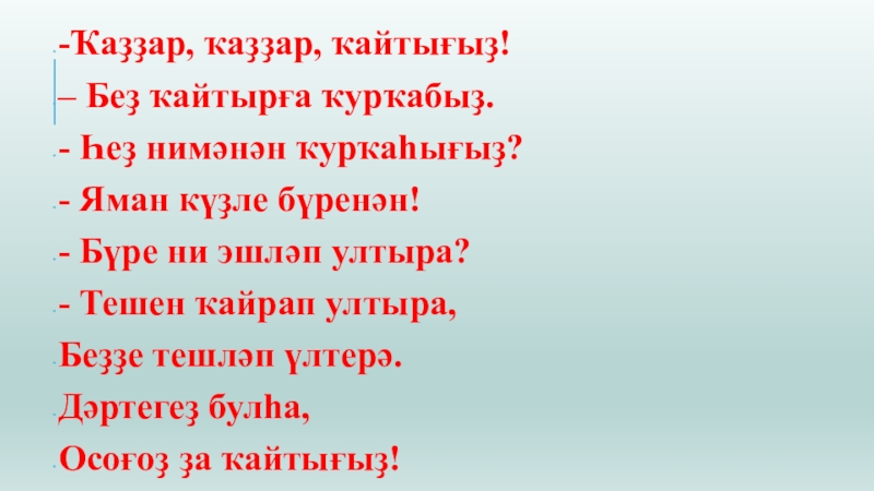 -Ҡаҙҙар, ҡаҙҙар, ҡайтығыҙ!– Беҙ ҡайтырға ҡурҡабыҙ.- Һеҙ нимәнән ҡурҡаһығыҙ?- Яман күҙле бүренән!- Бүре ни эшләп ултыра?- Тешен