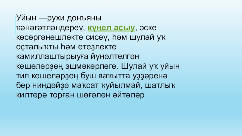 Слайд 3Уйын —рухи донъяны ҡәнәғәтләндереү, күңел асыу, эске көсөргәнешлекте сисеү, һәм шулай уҡ оҫталыҡты