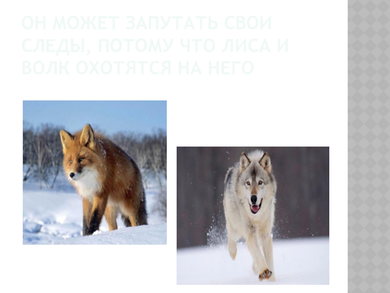 Слайд 9Он может запутать свои следы, потому что лиса и волк охотятся