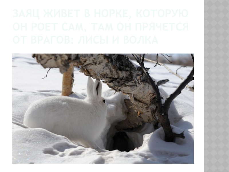 Слайд 4Заяц живет в норке, которую он роет сам, там он прячется